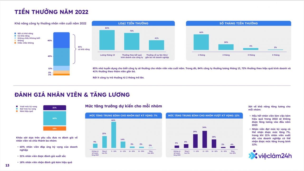 Về phía các bộ phận nhân sự tại nhiều doanh nghiệp, báo cáo Thị trường lao động và xu hướng tìm việc, lương thưởng phúc lợi 2023 của Việc Làm 24h cũng đưa ra số liệu cho biết 85% doanh nghiệp sẽ thưởng cho nhân viên (bao gồm lương tháng 13) vào dịp cuối năm. Phần lớn doanh nghiệp thưởng 1 tháng lương. Đây là tin đáng mừng cho người lao động dịp cuối năm khi có thêm một khoảng thu nhập để trang trải cho bản thân và gia đình trong dịp Tết.