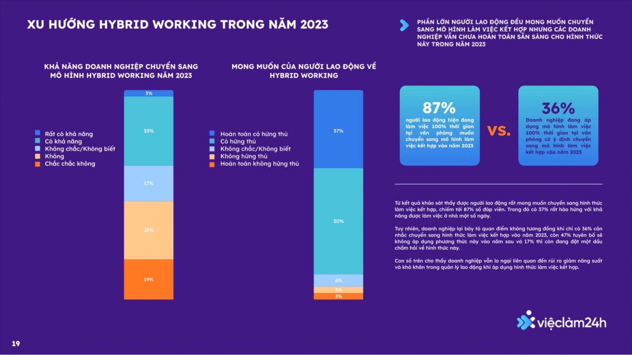 Về xu hướng Hybrid Working, đa số người lao động (87%) bày tỏ mong muốn được chuyển sang mô hình này trong năm 2023. Tuy nhiên, trước mong muốn này của người lao động, nhiều nhà tuyển dụng vẫn còn rất e dè. Xu hướng hybrid working phổ biến trong giai đoạn bình thường mới hậu Covid-19, tuy nhiên, trong năm 2023, chỉ có 36% nhà tuyển dụng sẵn sàng chuyển đổi làm việc linh hoạt. Nguyên nhân có thể đến từ lo ngại năng suất lao động của nhân viên sẽ bị giảm sút khi họ không làm việc tại văn phòng, các nhà quản lý cũng không thể kiểm soát được lịch trình của nhân viên.